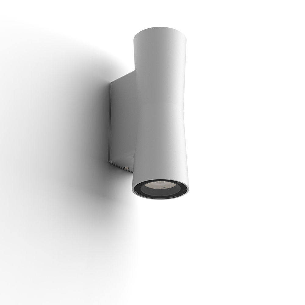 Double-emission fixture for wall mounting, suitable for outdoor environments (IP65), with wide operating temperature range: -20°C / +50°C. The body is made of die-cast aluminum protected by polyester epoxy paint to ensure corrosion resistance of 1500 hours in salt spray. The light source is a single 14W Power Led chip powered by 220Vac (integrated power supply). The luminous flux and distinctive design make it ideal for illuminating facades and architectural details. Color rendering index CRI > 90. Optional anti-glare (honeycomb) is provided.