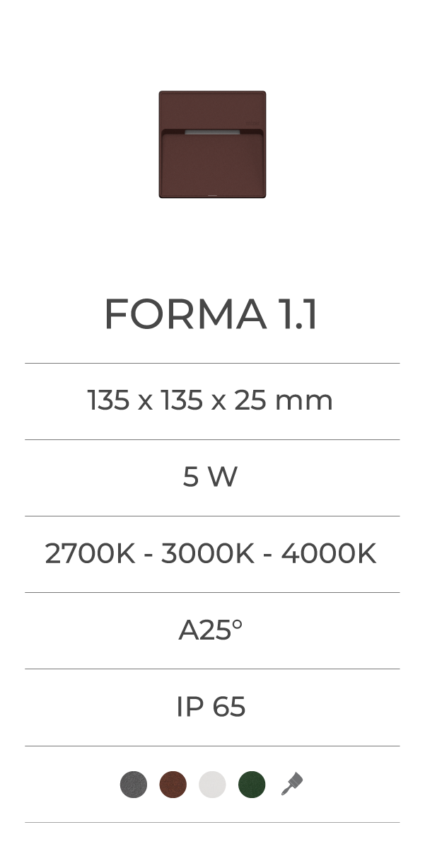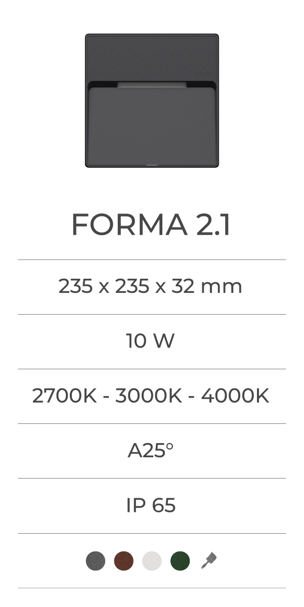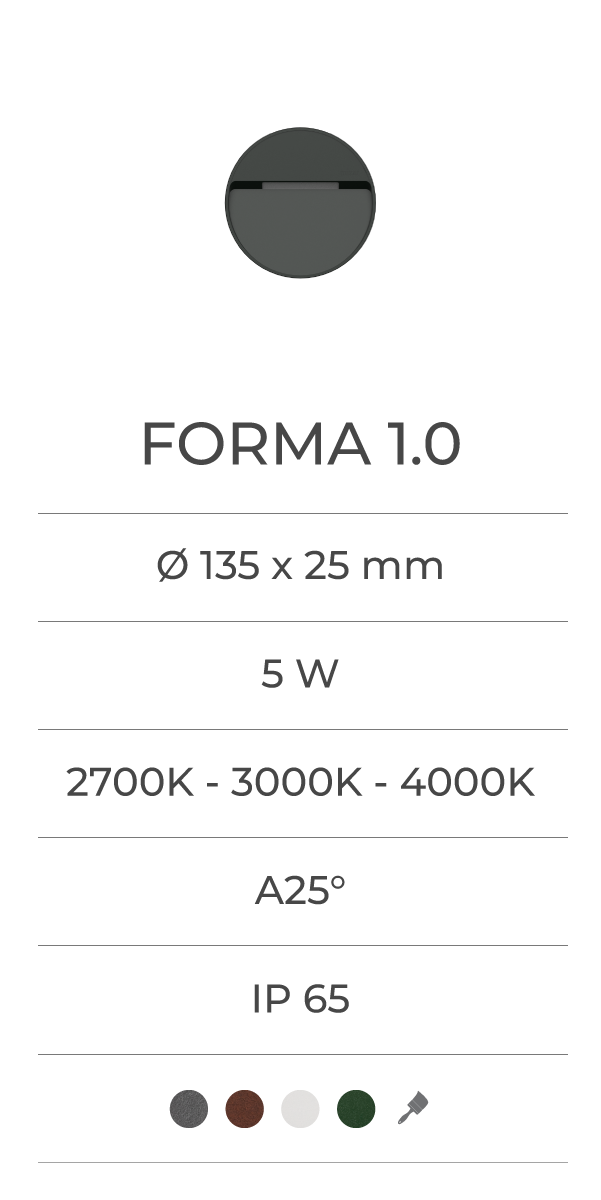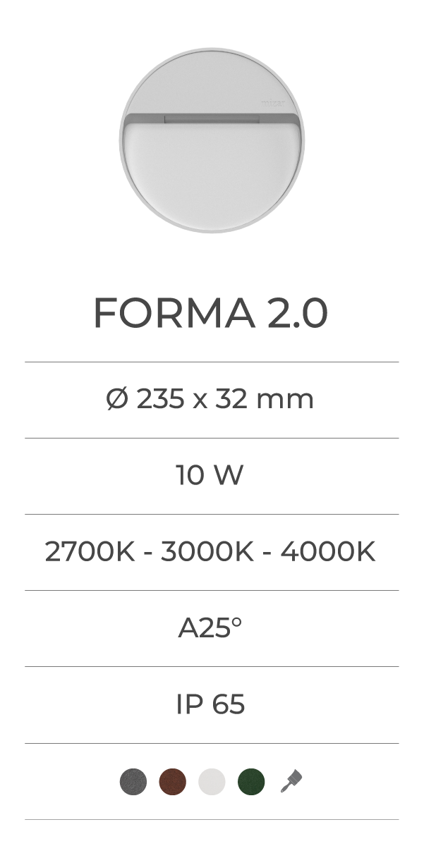 La serie FORMA è offerta con un’ampia scelta di temperature colore: 2700K , 3000K e 4000K. Inoltre – su richiesta – sono disponibili versioni con temperatura colore estremamente calda (2200 K).