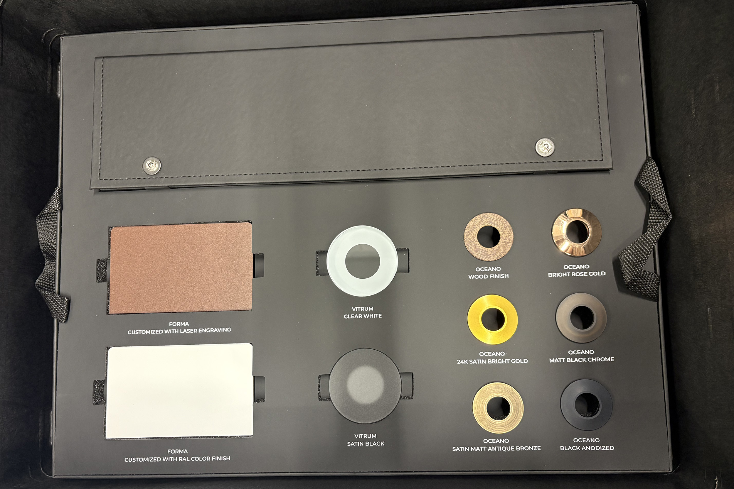 Nel vassoio inferiore, estraibile, trova spazio una rappresentazione dedicata alle finiture standard e alle finiture speciali su richiesta.