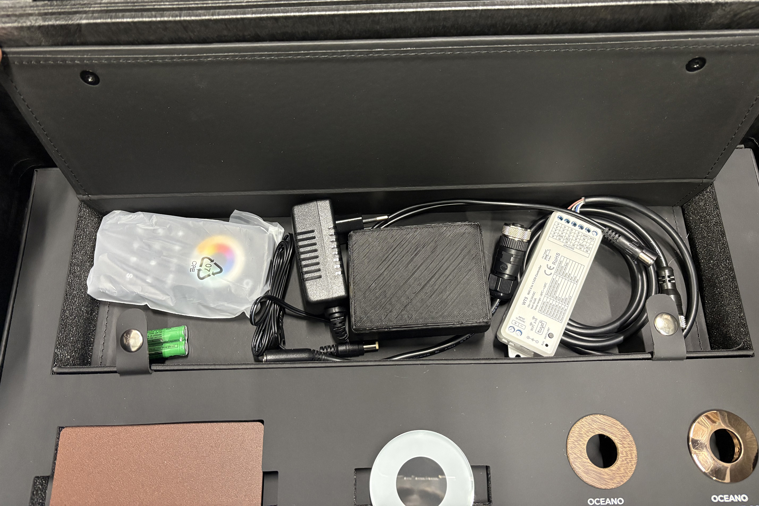 La valigia include uno scomparto dedicato per gli accessori elettronici, con alloggiamento per controller PWM, telecomando, caricatore 24V e batteria portatile con connettore rapido.